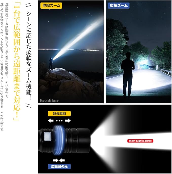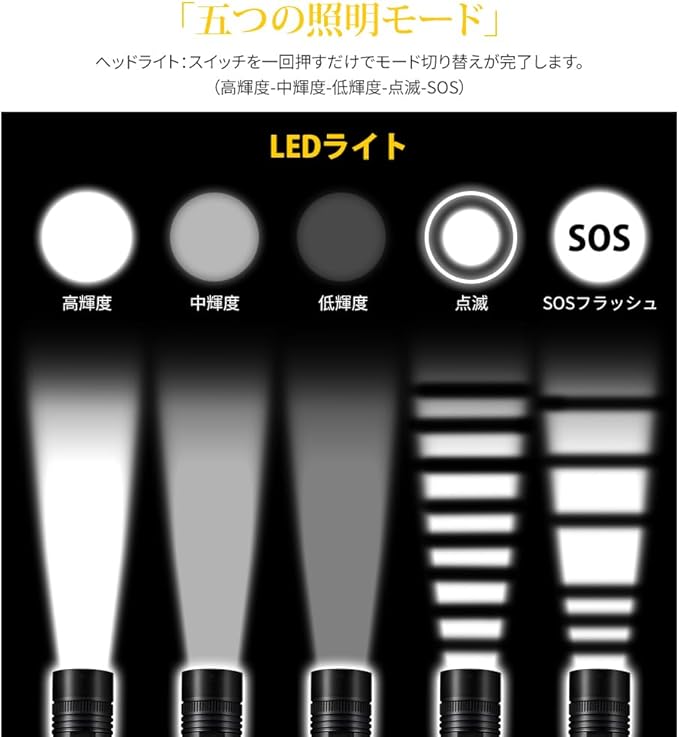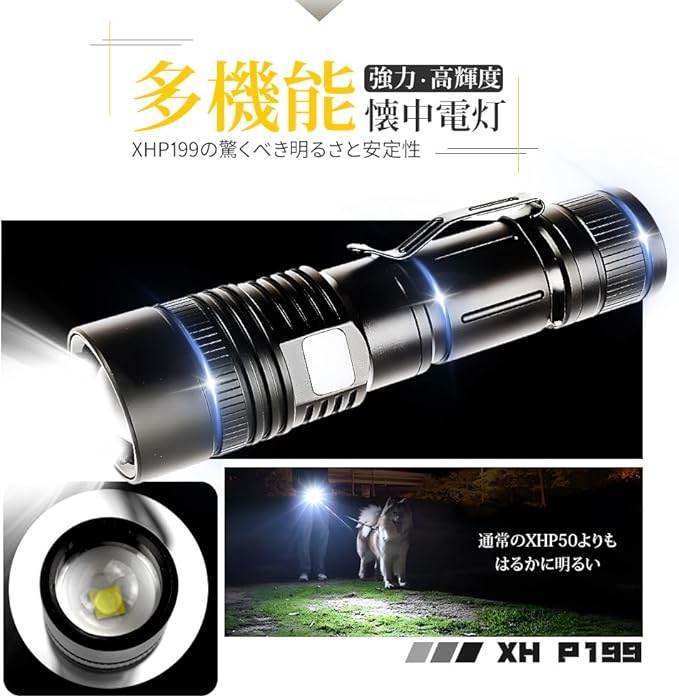 1.【進化版LED高輝度ライト】 XHP199 LEDチップを搭載し、業界でもトップクラスの明るさを実現。広範囲を明るく照らし、暗所でもしっかり視界を確保できます。約10万時間の長寿命設計で、片手でも扱いやすいコンパクトサイズ。付属のハンドストラップとペンホルダーで、携帯性にも優れています。