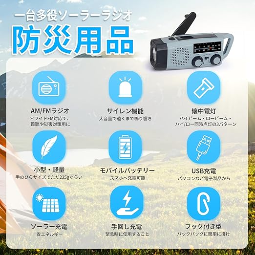 【コンパクト・軽量、携帯性が最高】GF-SOR3は軽くて手に持ったときにフィット感のある超軽量225gの小型の多機能ラジオです。ラジオ機能だけでなく、ライトやモバイルバッテリーなどの付属機能が充実した商品です。コンパクト、軽量の仕様で持ち運びしやすく、更に登山フック付き設計してバックパックに簡単に掛けられます!アウトドアでのキャンプや旅行など時に普通のラジオ音楽やニュースなどをいつでもどこでも気軽に鑑賞できます。