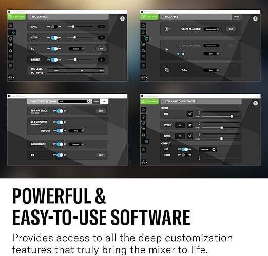 高度なソフトウェアマイク設定と音声エフェクト(圧縮、リミッター、リバーブ、ピッチ、ラジオボイスなど)により、音声を微調整してパーソナライズできます。さらに、ワンタッチボタンで瞬時に起動できます。