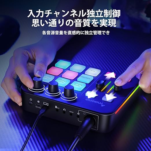 MAONO ゲーミングオーディオミキサー オーディオインターフェース ミュート ボイスチェンジャー リバーブ PC/スマホ/マイク/ヘッドホン対応 オーディオミキサー ゲーム用 配信 ポッドキャスト 実況 XLR接続 RGB機能 ポータブル一 ミキサー a