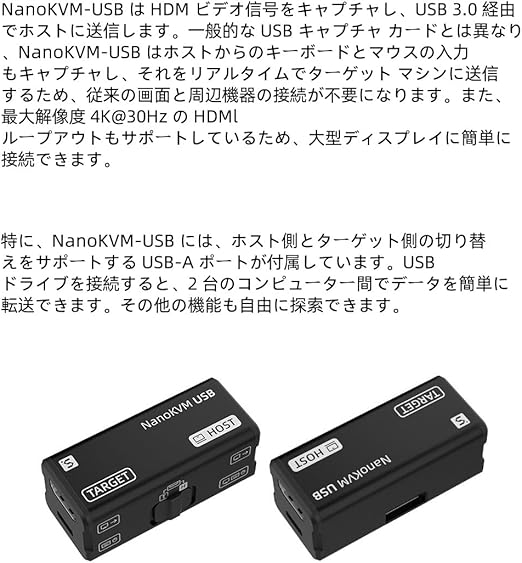 NanoKVM-USB は HDMI ビデオ信号をキャプチャし、USB 3.0 経由でホストに送信します。一般的な USB キャプチャ カードとは異なり、NanoKVM-USB はホストからのキ