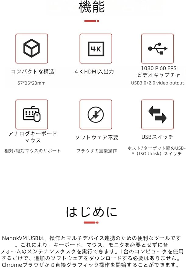 NanoKVM-USB は、操作や複数デバイスのコラボレーションに便利なツールです。キーボード、マウス、モニターを必要とせずにメンテナンス作業を実行できます。1 台のコンピューターのみを使用し、追加のソフトウェアをダウンロードすることなく、Chrome ブラウザーから直接グラフィカル操作を開始できます。