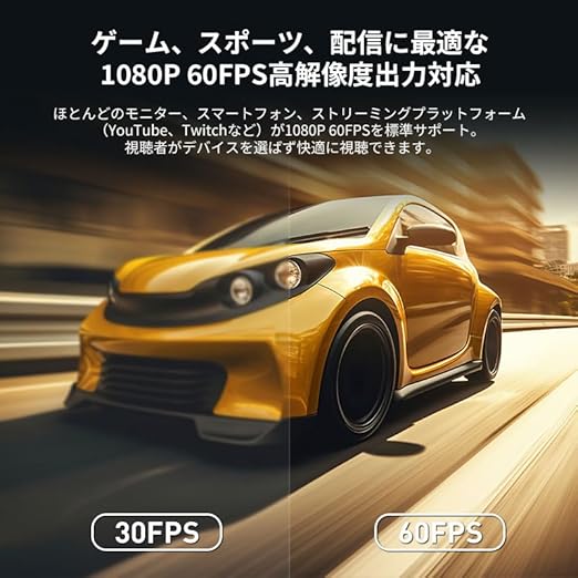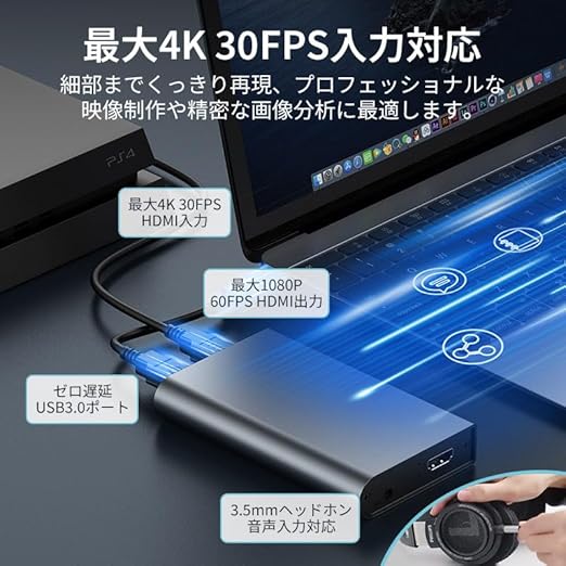 1080p/60fps・4Kパススルー 高解像度---最大入力解像度:4K(3840x2160)p@ 30FPS、最大出力/録画解像度:1920x1080 @ 60FPS このゲームキャプチャーは1080P 60FPSをサポートし、ゲームのリアルタイム転送に非常に適しています。驚異の1080p60画質は、他のゲームキャプチャーよりもっと高画質で、Facebook、Twitch、YouTubeなどの動画配信サイトでゲーム実況をする際に必要なキャプチャーボード