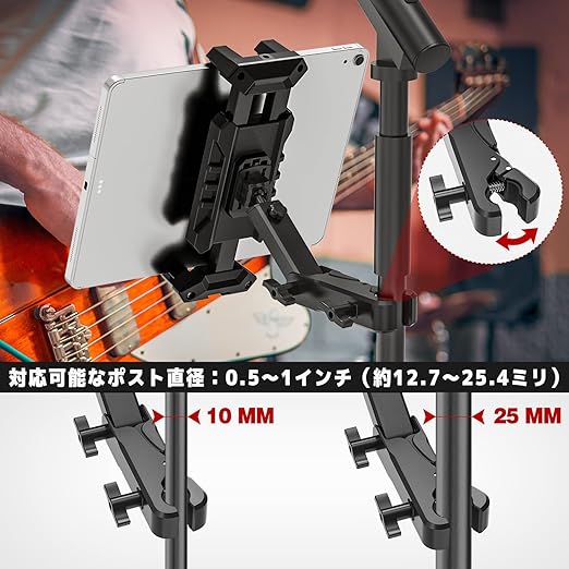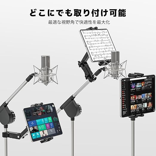 【マイクスタンド専用設計・タブレットホルダー】コンサートや合唱練習、ウェディング、パーティー、会議など、さまざまなシーンでiPadを簡単に設置・調整可能。タブレットで歌詞やコードを表示するのに最適なほか、バックトラックの再生やライブ電子音楽のパフォーマンスコントロールにも便利です。