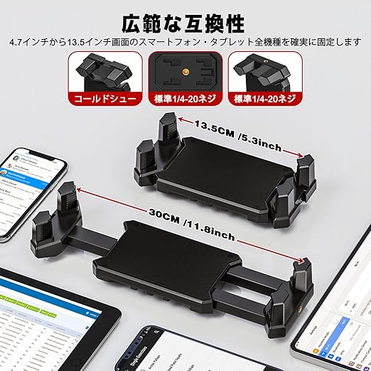 【頑丈な作りで自由な調整が可能】伸縮可能なアーム(約6~12cm/2.36~4.72インチ)と、90度上下左右に動くジョイントボールピボットを搭載。360度回転させて最適な視野角を設定でき、縦向き・横向きの切り替えも