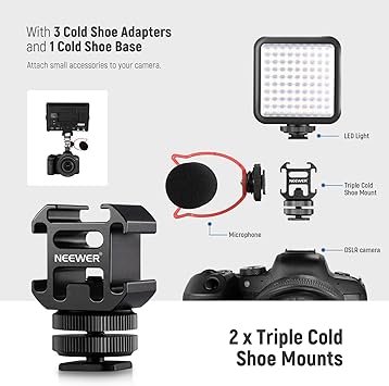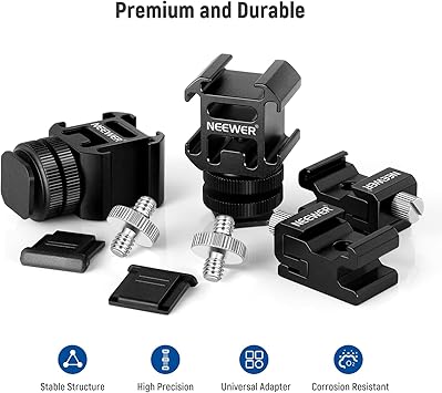 【8パックシューマウントアダプターセット】NEEWER 8イン1セットには2×トリプルコールドシューマウント、2×スピードライトスタンドブラケット、2×カメラホットシューカバー、2×1/4インチ-20オスから1/ 4”-20 オネジアダプター。アダプター キットは高品質の素材 (主にアルミニウム合金、プラスチック製のホットシュー カバーを除く) を使用して、カメラ アクセサリーの取り付けに最適な解決方法を提供します。