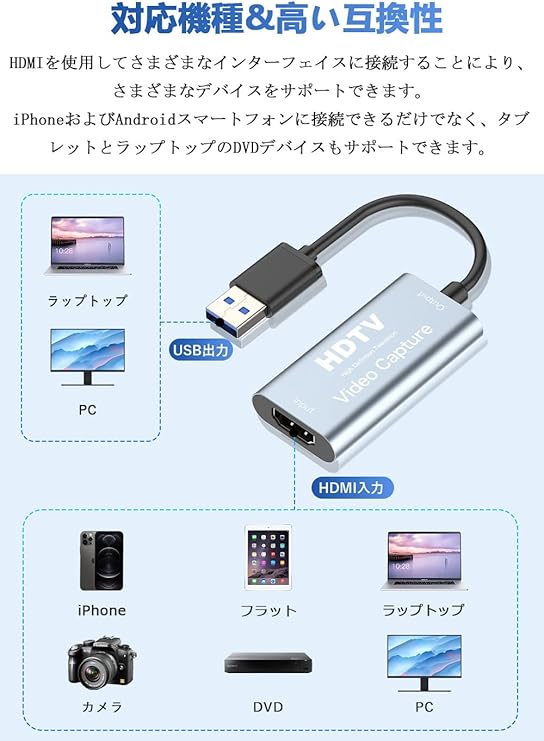 【HDMIキャプチャーボード】この HDMI ゲーム キャプチャは、ほとんどのデバイス コンバーター (スマートフォン、ゲーム コンソール、カムコーダー、テレビ、DVD など) に接続して、PC/ラップトップを使用して録画およびライブ ストリームを行うことができます。 既存の動画編集ソフトに適しており、映像は鮮明で遅延がありません。