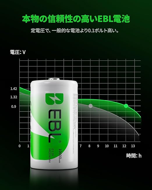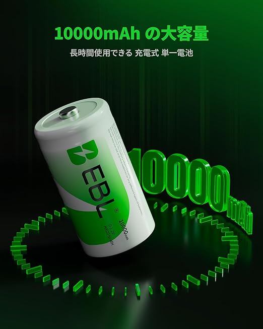 EBL 単1電池 充電式 4本入り 電池ケース2個付き 1.2V大容量 10000mAhで長持ち 約1200回使用可能 おもちゃ、LED懐中電灯、ラジオ、ゲームカメラ、給湯器に適用 単1充電池 a