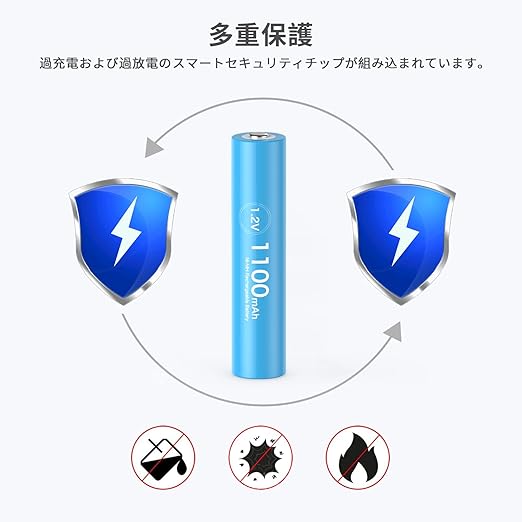 【商品内容】単四電池1100mAh充電式電池* 8、液晶充電器* 1、単三電池収納ケース* 2、充電ケーブル*1、充電器取扱説明書*1;充電を繰り返し使っても劣化が少ないです。Hg/Cd/Pdなどの有害物を使わず、エコタイプの電池です。