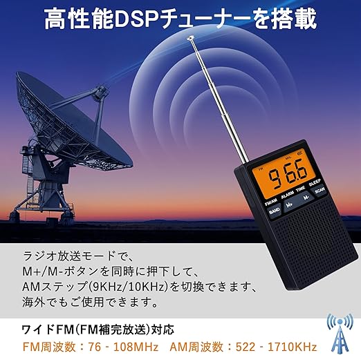 高感度受信&大文字表示:高性能DSPデジタルチューナー搭載のFM/AMポケットラジオです。大きいSTN液晶を採用、明るいバックライト付き、大文字表示、多角度からより明晰に見えます。
