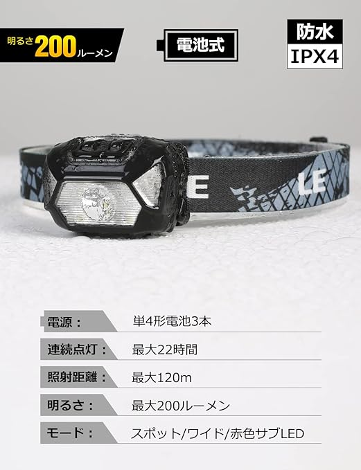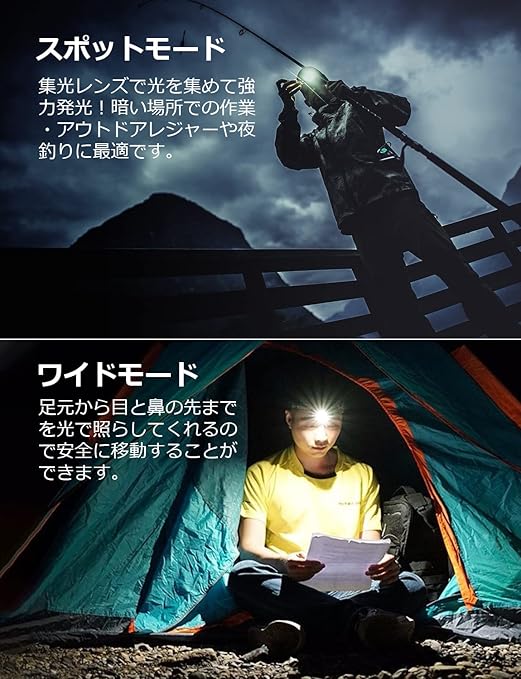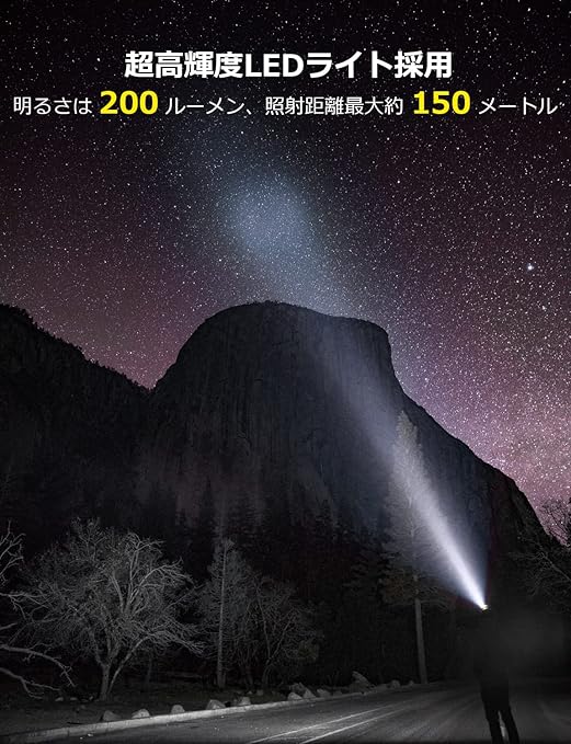 【高輝度LEDライト・照射角度調整可・防災停電対策】明るさは200ルーメン、最大照射距離約150メートル。夜間の散歩や暗い場所での活動に大活躍します!地震や災害、突然の停電時にも役立ちます。ヘッドライトの先端は45度まで角度調整が可能で、足元だけでなく周囲も広く照らし、危険を避けやすくなります。