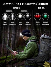 【スポット・ワイド・赤色サブLED切替】スポットモード:High/6時間点灯、Low/19時間点灯。ワイドモード:High/7時間点灯、Low/22時間点灯。赤色LEDモード:赤色点灯とSOS赤緑点滅/