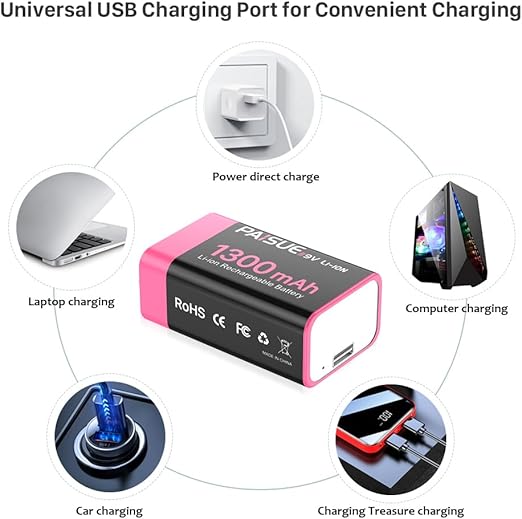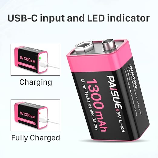 Paisue 9V 充電式 電池、1300mAh リチウムイオン 電池 9ボルト 角型バッテリー、煙探知機、マイク用、 火災報知器/トランシーバーに対応 USB-C急速充電ケーブル付き(2本入り) a