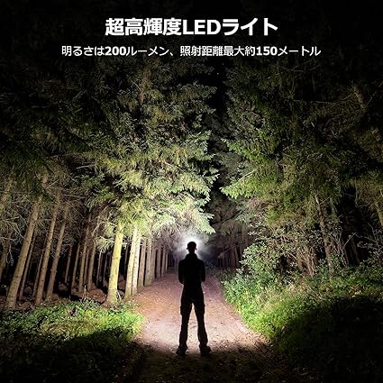 【高輝度LEDライト・アウトドアで大活躍】最大200ルーメンの明るさで、照射距離は約150メートル。暗闇でも広範囲をしっかり照らし、視認性が向上します。登山や釣り、キャンプなどのアウトドア活動はもちろん、夜間作業や非常時の備えとしても活躍します。