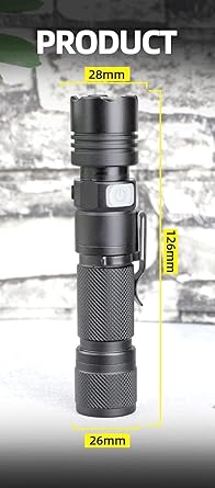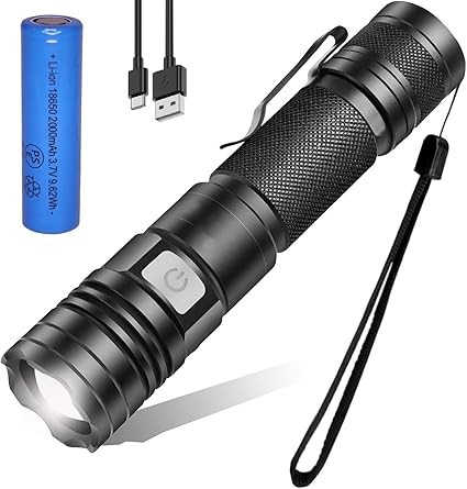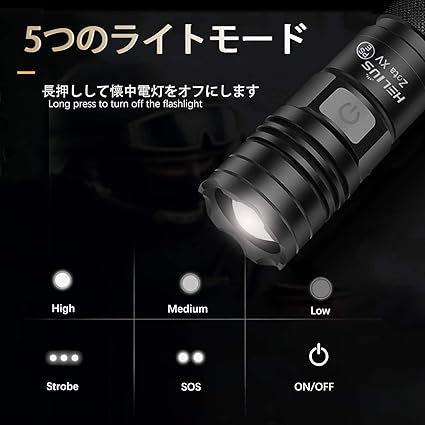 【5モード調光★ズーム機能】充電式LED懐中電灯は操作が簡単で、片手操作スイッチで5つの異なるギアを切り替えることができます。高—中---低 - フラッシュ、SOS、長押すとシャッ