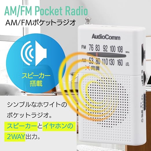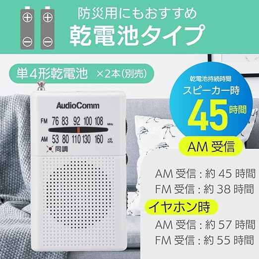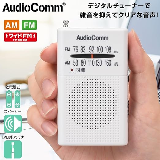 【 特 長 】 ◆ デジタルチューナーで雑音を抑えてクリアな音声 ◆ ワイドFM(FM補完放送)対応 ◆ 同調ランプ付き ◆ FMロッドアンテナ ◆ モノラル受信 ◆ イヤホン付属 ◆ 本体カラーはホワイト【 仕 様 】 ◆ 受信周波数:AM…530~1605kHz、FM…76~108MHz ◆ 電源:DC3V 単4形乾電池×2本(別売) ◆ 電池持続時間:※アルカリ乾電池新品使用 ・イヤホン使用時…AM受信/約57時間、FM受信/約55時間 ・スピーカー使用時…AM受信/約45時間、FM受信/