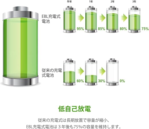 EBLの保証&ご注意点:すべてのEBL製品は1年間制限ある保証付いています。※使用する前に極性に正しく挿入されているかどうかご確認ください。※充電池は涼しく乾燥した場所に保存してください。※長時間アイドル状態になっていた場合は、 少なくとも3ヶ月に1回は充放電してください。