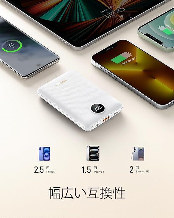 【業界新設計&22.5W 急速充電】モバイルバッテリー 軽量 小型 大容量 薄型 10000mAh VEEKTOMX PD QC 3.0 USB Type-C入出力/ポート 安全回路保護 携帯充電器 LCD残量表示 PSE認証済 スマホ充電器 iPhone/Android/iPad全種機器対応 コンパクト 持ち運び便利 165g 機内持ち込み可能 旅行/出張/アウトドア/停電/防災緊急用 ホワイト a