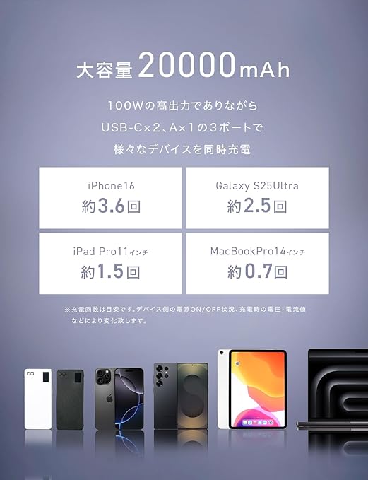【ノートパソコンも充電できるモバイルバッテリー】SMARTCOBY Pro CABLEは単ポート最大100W、高出力でApple MacBook Pro 、パナソニック Let's note(レッツノート)といったハイエンドノートPCも充電可能なモバイルバッテリーです。大容量20000mAh搭載で、ノートPCを用いたミーティングを伴う出張など、充電環境に不安のあるビジネスシーンにおいておすすめです。