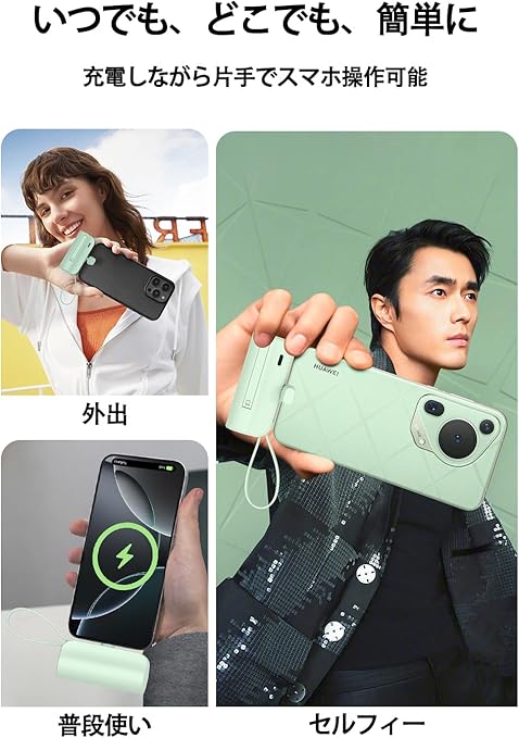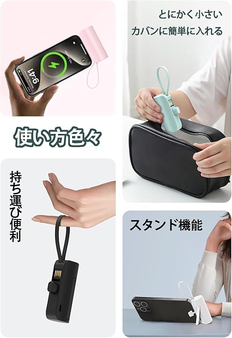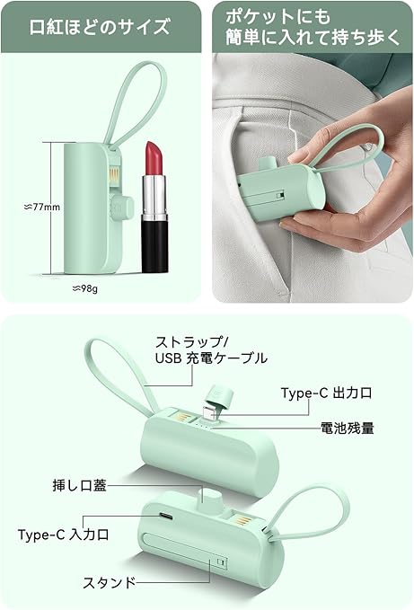【軽量でパワフルな5000mAh】 手のひらサイズのコンパクト設計ながら、大容量5000mAhでスマホのフル充電が可能。外出先でも長時間使用でき、バッグやポケットにすっきり収納。