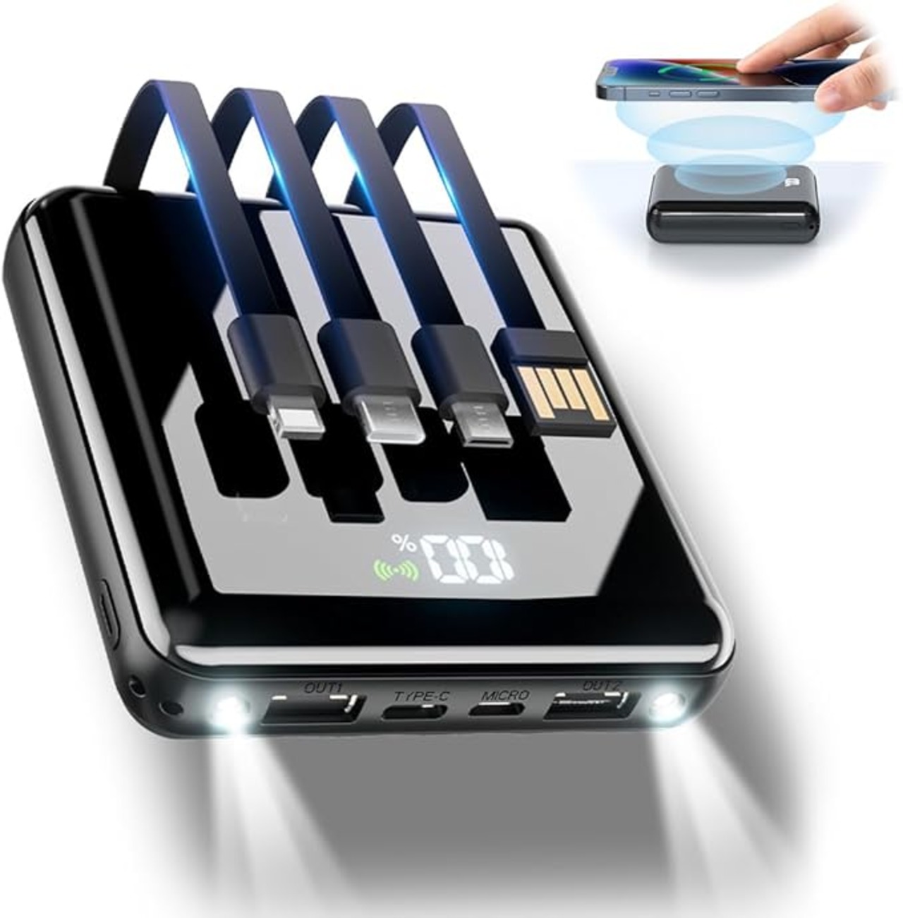 【6台同時充電可能 &4本ケーブル内蔵&ワイヤレス充電】出力にはUSB-A ×2ポートと3規格のケーブル内蔵とワイヤレスで6台同時に充電可能です。入力にも充電ケーブル内蔵と蓄電用microポートと蓄電用Type-Cポートの3つ選択肢があり、お持ち運びが便利になります。出力にはmicroUSB、USB type-Cなど3規格出力ケーブルが内蔵された最新型のケーブル内蔵モバイルバッテリーです。専用ケーブルを持ち歩く必要がなく、各種タイプのデバイスにも対応出来ます。更に、モバイルバッテリーの本体に充電