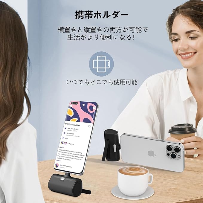LUCKYDUO モバイルバッテリー 軽量 小型 5000mAh Type-Cコネクター内蔵 コードレス コンパクト 直接充電 急速充電 LCD残量表示 LEDライト&スマホホルダー付き Android用iPhone16/15/Xperia/Galaxy/Pixel/HUAWEI/ゲーム機など充電対応 PSE認証済(ブラック) a
