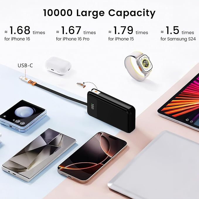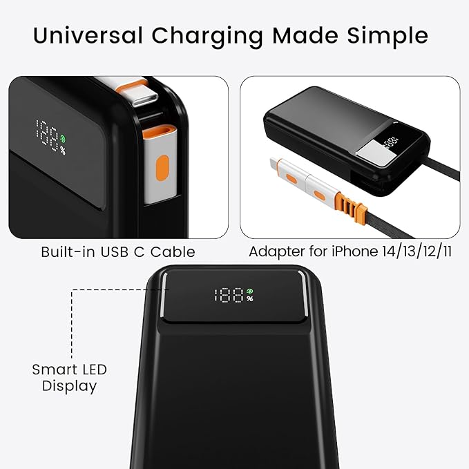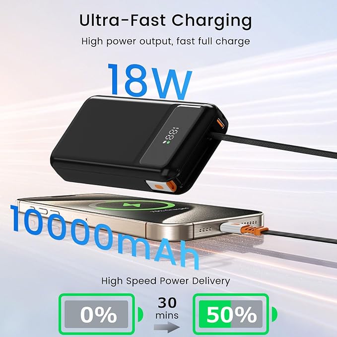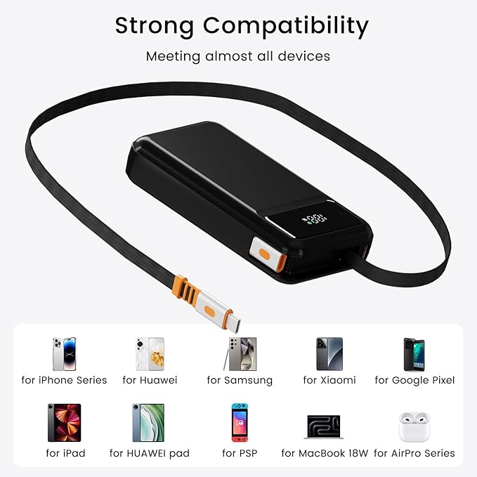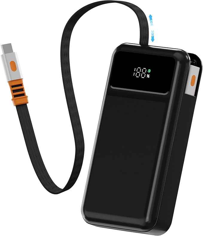 【自動巻き取り式ケーブル内蔵】モバイルバッテリーには約70cmのType-Cケーブルが巧みに内蔵されています。充電のときは引き出し、使用後、軽く引っ張って、プラグ上のマグネットでピタッと収納できます。ケーブル一体型の設計により、収納簡単と携帯便利を兼ね備えて、旅行にも通勤にも最適です。