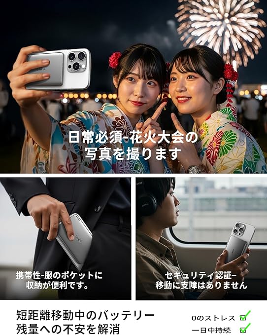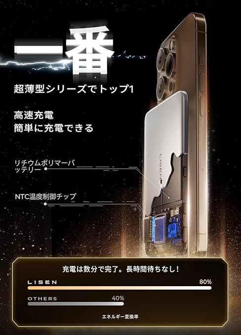 LISEN 超薄型 Magsafe対応 モバイルバッテリー マグセーフ 5000mAh 軽量 小型 0.8mm マグネット式ワイヤレス充電対応 PSE認証済み iPhone 16 15 14 13 12 Pro Max Mini シリーズ 機内持ち込み可 旅行 出張 災害用 a