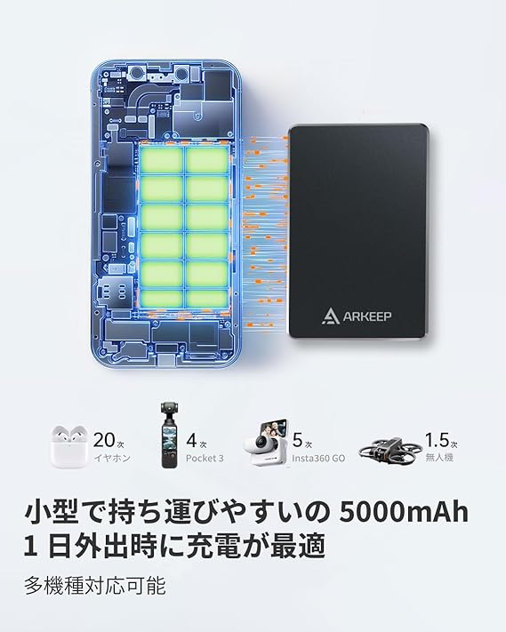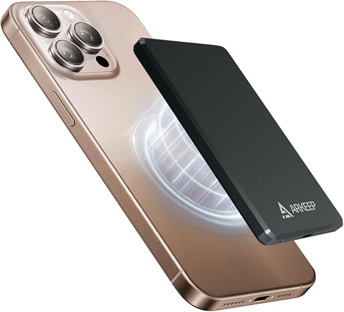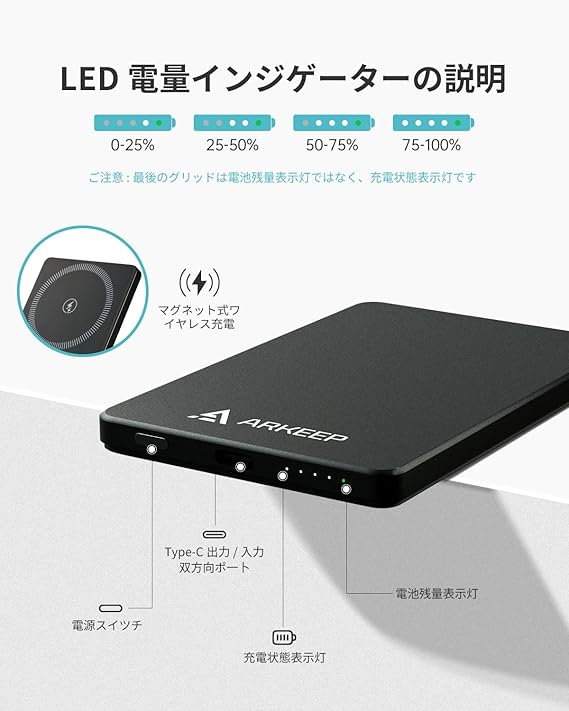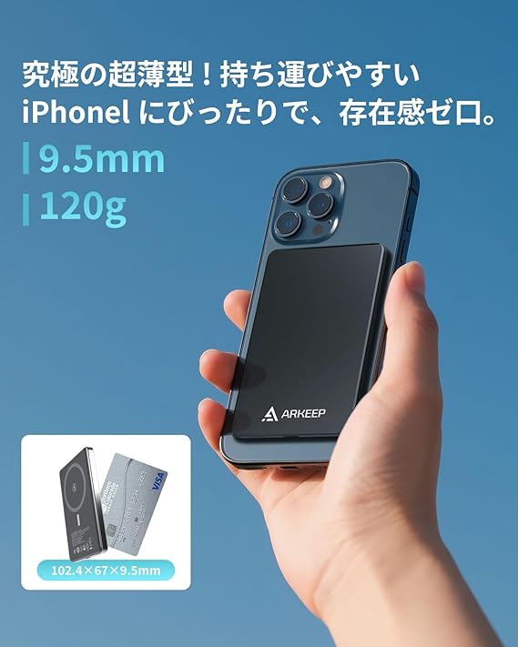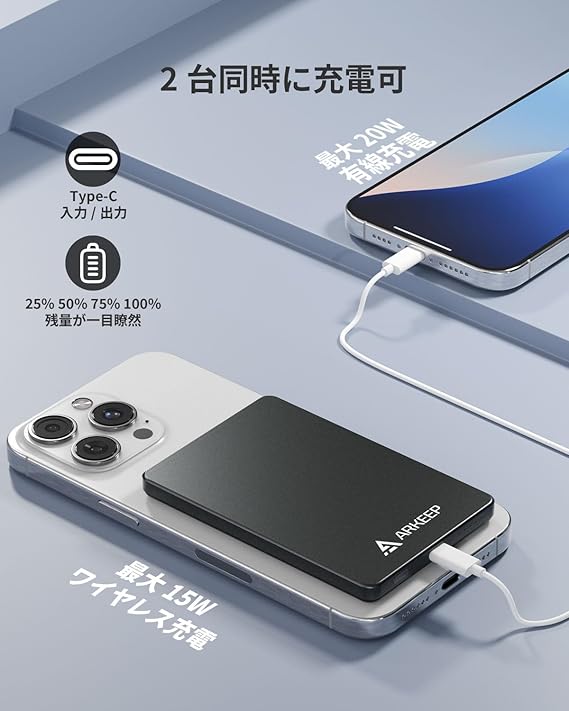 ARKEEP モバイルバッテリー 薄型 9.7mm 軽量小型 マグネット式 5000mAh PD20W高速充電 2台同時充電可能 PSE認証済 ワイヤレス充電器 iPhone/Samsung/iPadなど多機種対応 急速充電 持ち運び便利 a