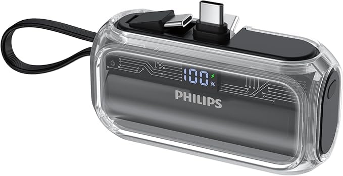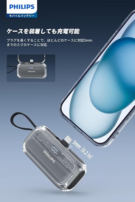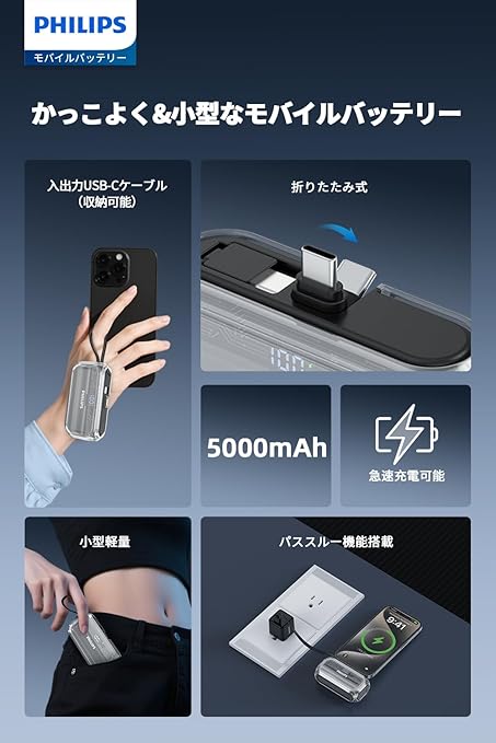 Philips (フィリップス) モバイルバッテリー 5000mAh 小型 USB-Cコネクター USB-Cケーブル内蔵 軽量 直差し コードレス 大容量 二台同時充電 モバイル充電器 パススルー機能 PSE認証済 タイプc デバイス対応 DLP2568C (ブラック) a
