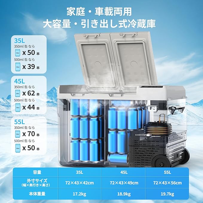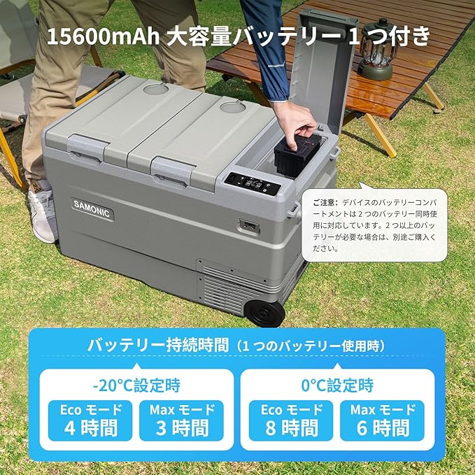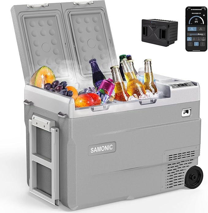 SAMONIC 車載冷蔵庫 モバイルバッテリー付き 35L -20℃〜20℃ 2室独立温度管理 急速冷凍 アプリで遠隔操作 ポータブル冷蔵庫 4WAY電源対応 DC12V/24V AC100V 専用着脱式バッテリー 静音 大容量 省エネ 車載用冷蔵冷凍庫 持ち運び便利 キャスターとハンドル付き 車載家庭両用 キャンプ 台風対策 (グレー, 55L) a