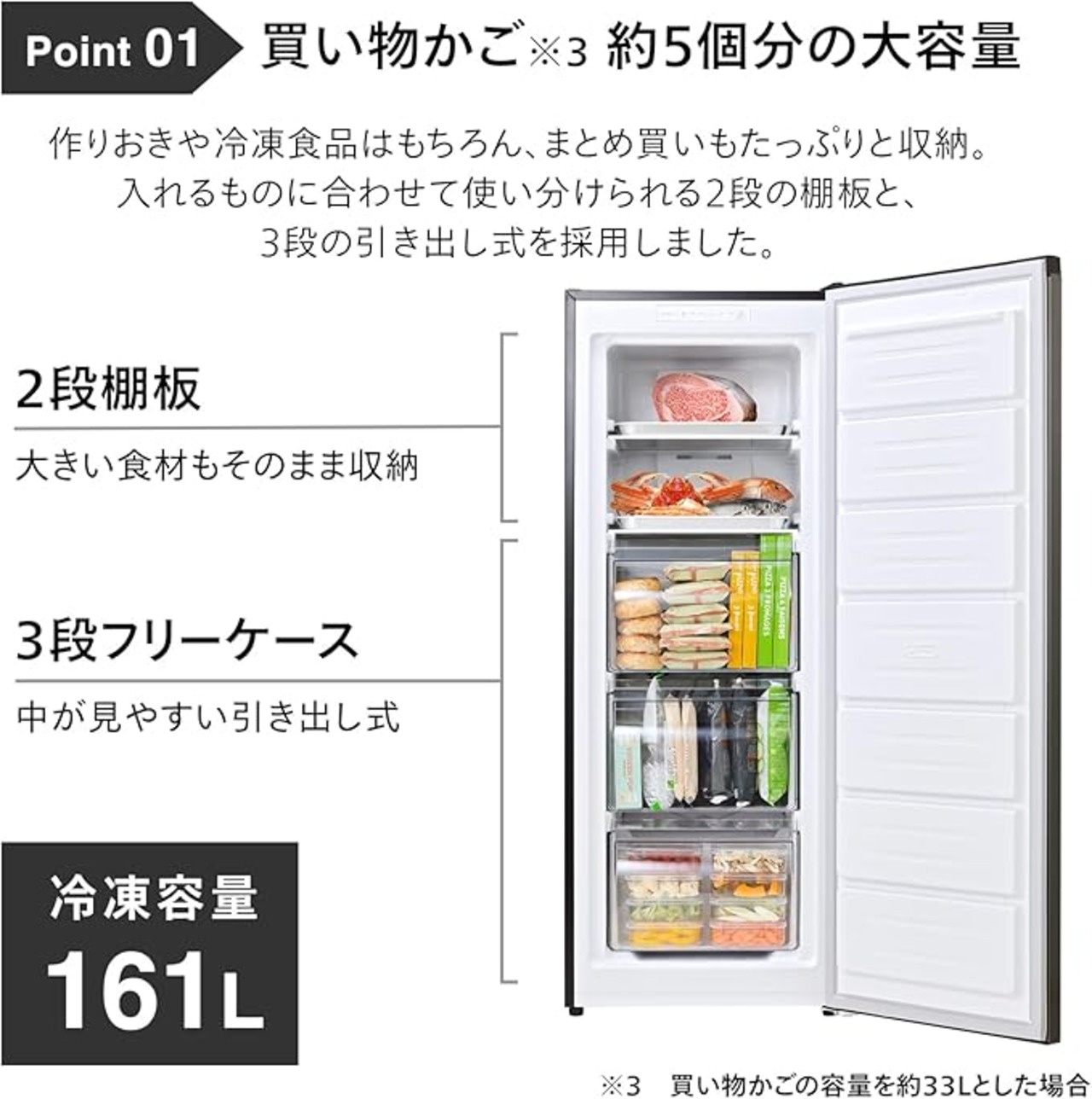 【買い物かご約5個分の大容量】作りおきや冷凍食品はもちろん、まとめ買いもたっぷりと収納できる161Lの大容量。