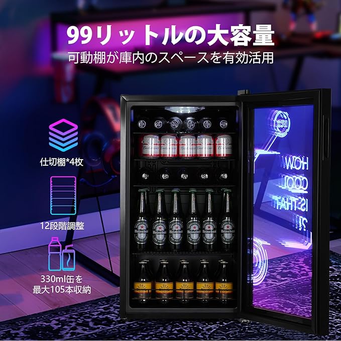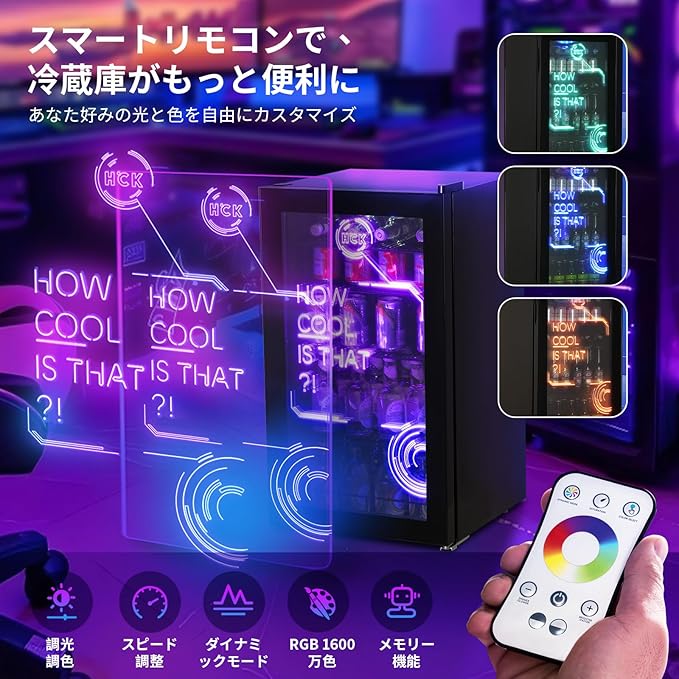 ゲーミング冷蔵庫の進化版!RGBリモコン対応で光の演出を自由自在に:サイバーパンクデザインのドリンク冷蔵庫に、リモコン操作可能なRGB LEDネオンライトを搭載。1600万色以上のカラーチェンジや点滅モードで、ゲームルームの雰囲気を一層スタイリッシュに演出。ゲーム中でも手軽に飲み物を取り出せ、ゲーマー向け冷蔵庫として活躍します