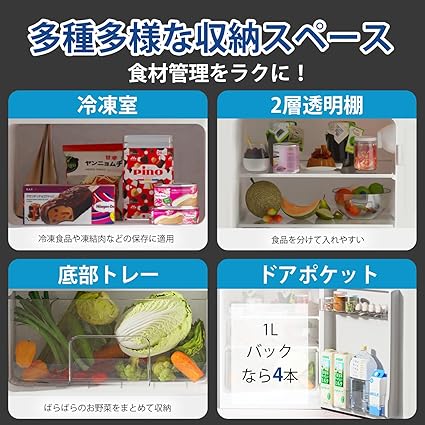 【便利な収納スペース】 ●冷凍室: 主に冷凍食品や凍結肉、アイスクリームなどの保存に適しています。食材の新鮮さを保ち、いつでも美味しいものを