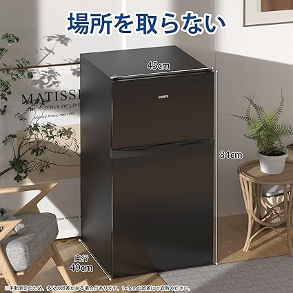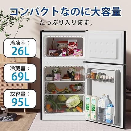【コンパクト・大容量】 長さ49cm、幅45cm、高さ84cm、占地面積わずか0.14畳、総容量95L(冷凍室28L、冷蔵室67L)。 ●1~2人暮らし向け。 コンパクトなのに様々な食材をたっぷり入れたり、簡単に収納したりすることができます。 ●場所に拘らずに、キッチンや寝室、リビングを最大限に活用できます。 限られたスペースでも手詰まりに感じさせません。