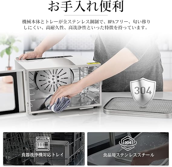 ❀【安全と清掃便利】この食品乾燥機は食品グレードSS304ステンレスに製作されますから、耐熱し、錆止めし、お手入れが簡単です。ステンレスだから、加熱しても劣化しないし、有害物質も出さないです。耐久性や使いやすさにこだわり、トレイも匂い移りしにくいステンレス鋼を採用し、食器洗浄機にも対応できます。一年保証付き、もし何か不具合がありましたらぜひ弊社までご連絡してください。