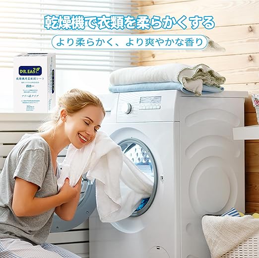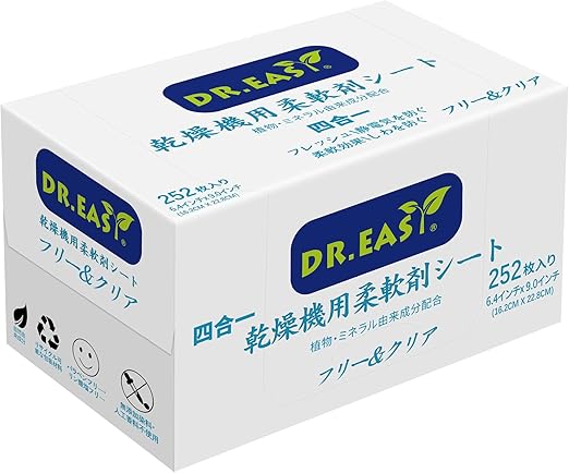 DR.EASY乾燥機用柔軟剤シート 植物由来成分 252枚入り フリー&クリア エッセンシャルオイル 香りのある 人工香料不使用 無染料 静電気防止 しわを防ぐ ペットの毛や糸くずの付着を予防できる a