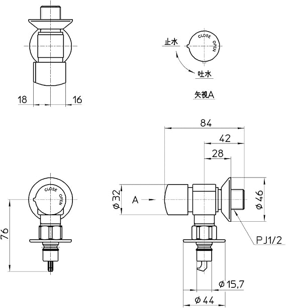 90度開閉なので出し止めが楽に行えます。メッキ仕様のハンドルに吐水、止水の表示付き。