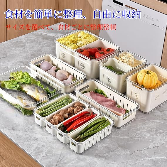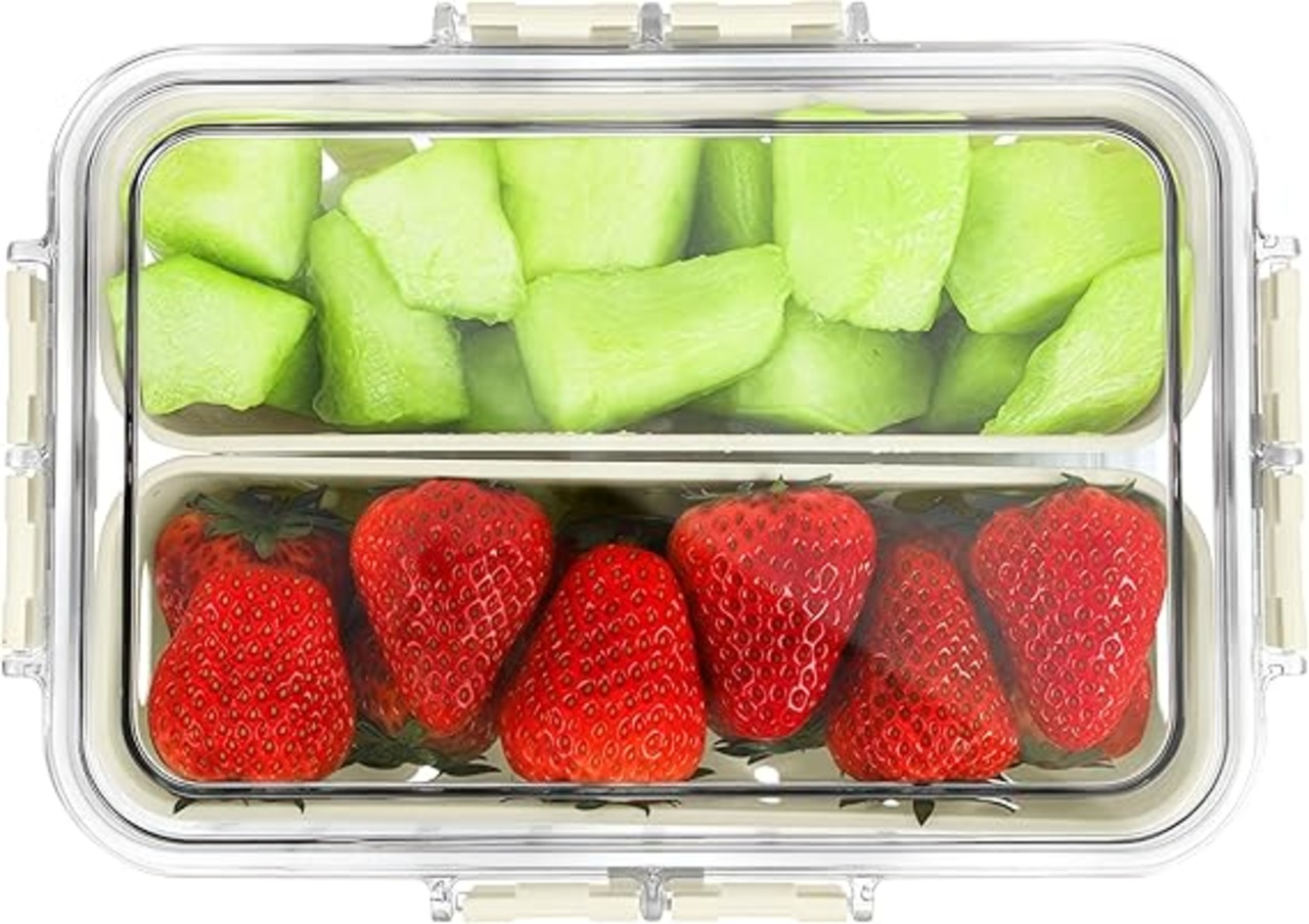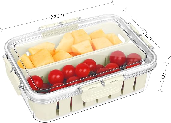 冷蔵庫用分割保存容器 2分割タイプ コンパクトサイズ 密閉保存ボックス シリコンパッキン+四面ロック設計 密閉防湿 防臭 冷蔵/冷凍対応 内部排水バスケット付き 果物 野菜を分類保存 生鮮お弁当ボックス 学校や職場のお弁当に最適 (中サイズ-2分割) a