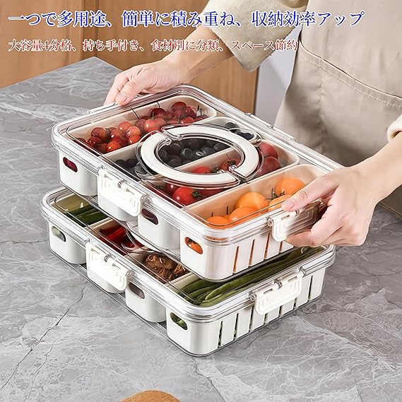 【分類収納でニオイ移りを防ぐ】2つの仕切り付きデザインで、果物や野菜を簡単に分けて保存可能。食材同士の接触を防ぎ、臭い移りをしっかり防止します。大切な食材を新鮮な状態で保ちながら、整理整頓が楽になります。