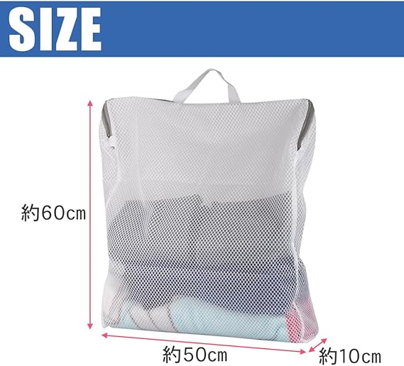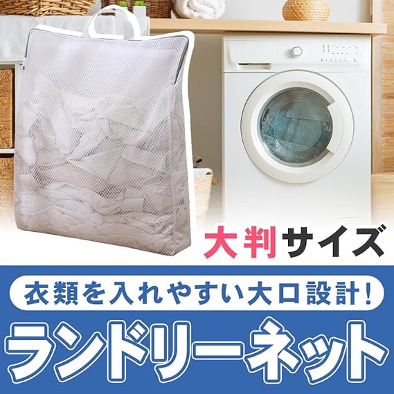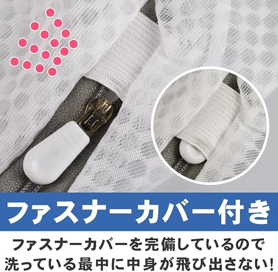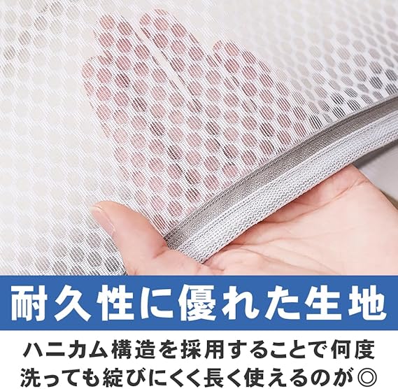 ハニカム構造のメッシュネットを採用し、頑丈で破れにくいところがポイントです。ファスナーカバー付きに加え一旦閉めると洗濯中に開きにくいファスナーなので