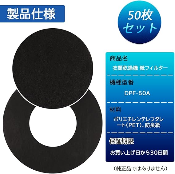 【製品仕様】 ❶対応機種型番:DPF-50A(ご注意:DPF-50ではない) ❷パッケージ内容:衣類乾燥機 フィルター50枚 ❸材質:ポリエチレンテレフタレート(PET) ❹ご注意:本製品は乾燥機 フィルターの純正品ではなく、互換用品です。