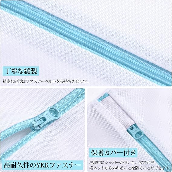 【高耐久性のファスナー付き】洗濯ネットには高耐久性のファスナーを採用しており、開閉しやすく、何度使ってもスムーズに滑るので、繰り返して利用可能、長時間使えます。服を洗うときに、ファスナーを専用のファスナーカバーに隠せるとともに、ちゃんと閉める設計が導入されたため、服の脱出を防げます。