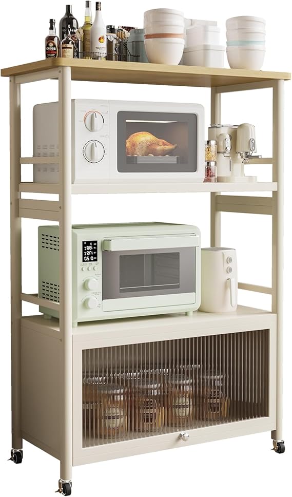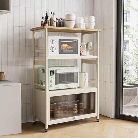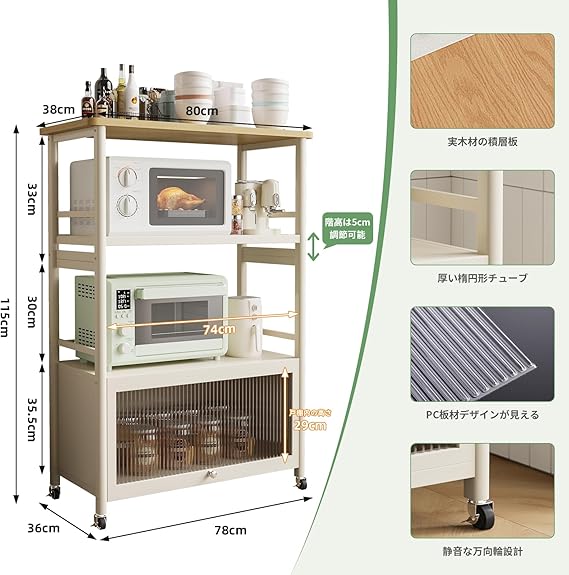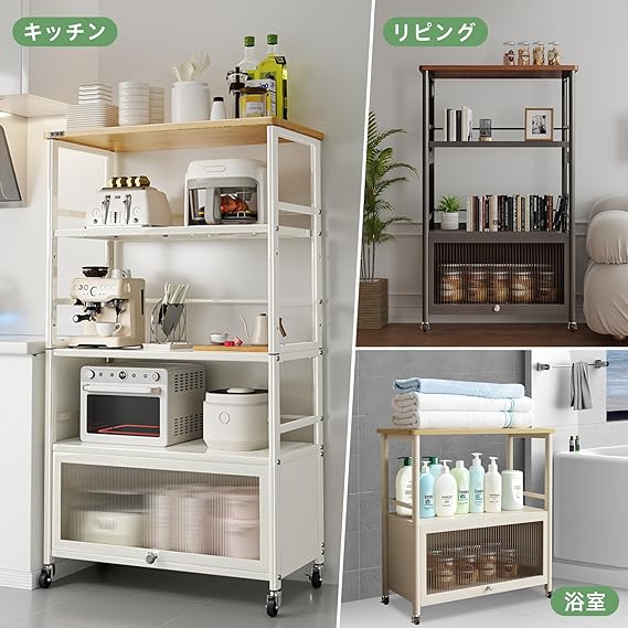 多機能性:最下層の隠し式の上開き扉が備わっており、扉はPC素材を使用しており、光を透過して透視しないです。扉は磁気で固定されるため、物を収納しながらほこりを防止して、あなたの台所をもっときれいにして、戸棚と段棚を自由に切り替えます;天板は木製で、平らで滑らかで、作業台にもな