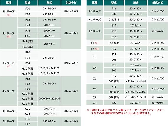 BMW 1シリーズ(F20/F40) 2シリーズ(F22/F23/F44/F45後期/F46後期/G42) 3シリーズ(F30/F31/F3/G20前期/G21前期) 4シリーズ(F32/F33/F36/G22前期/G23前期/G26前期) 5シリーズ(G30/G31) 6シリーズ(F06/F12/F13/G32) 7シリーズ(G11/G12) 8シリーズ(G14/G15/G16) X1(F48後期) X2(F39) X3(F25/G01) X4(F26/G02) X5(F15/G05前期) X