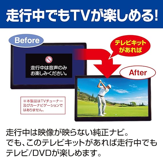 走行中は映像が映らない純正ナビ。このテレビキットシリーズがあれば、走行中でもテレビ/DVDが楽しめます。純正風スイッチで目立たずスマートに取り付け。