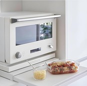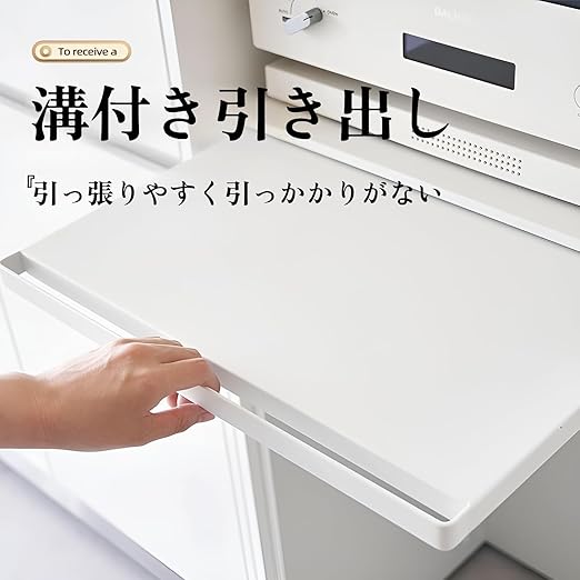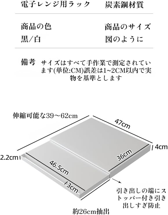 【耐荷重スライドテーブル】炭素鋼製スライドテーブル(47×36cm)で調理台拡張可能。耐荷重25kg対応/本体重量3kgの高剛性設計。レンジ下収納トレー(46.5×26cm/10kg耐)と連動し、食材・調味料・調理器具を瞬時展開。狭いキッチンでも作業面積2倍化で効率UP。