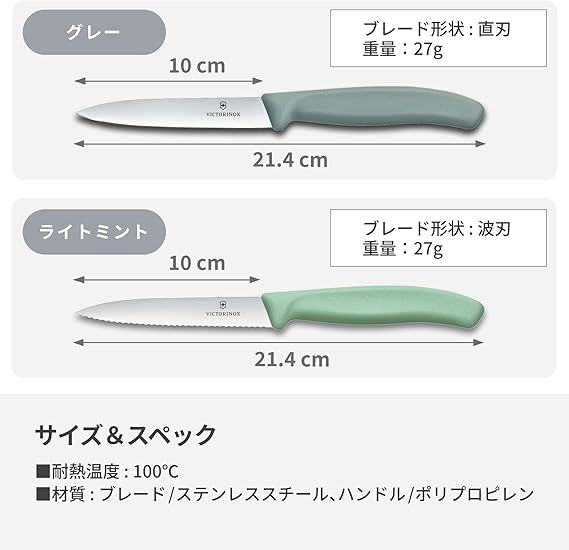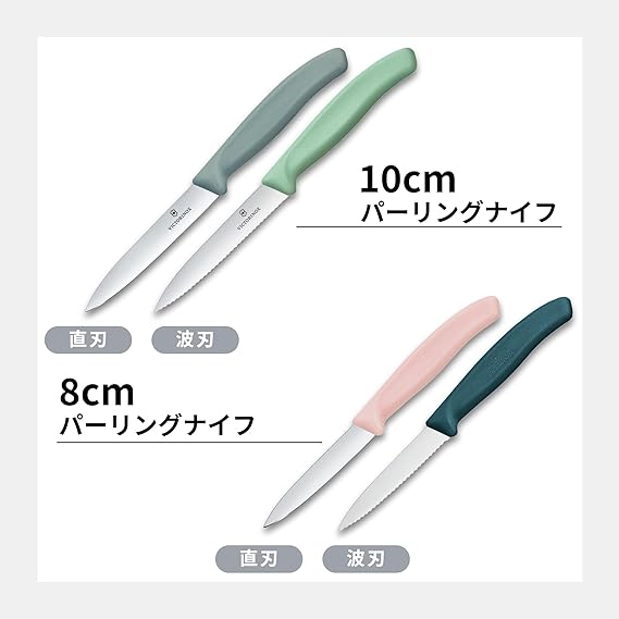 セット内容:パーリングナイフ直刃8cm(ライトピンク)、パーリングナイフ波刃8cm(ブルー)、パーリングナイフ直刃10cm(グレー)、パーリングナイフ波刃10cm(ライトミント)