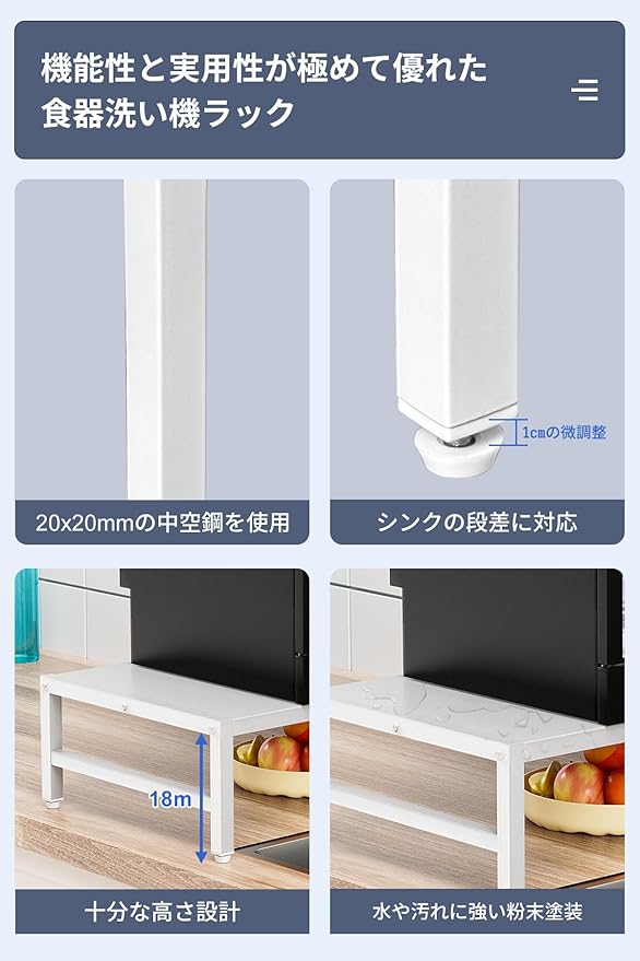 食洗機ラック 食洗機台 食洗機 置き台 伸縮食洗器ラック シンクに渡せる 頑丈・安定 段差対応アジャスター付き 滑り止め フック4個付き 省スペース 下段が一時置きとしても使える (ホワイト) a