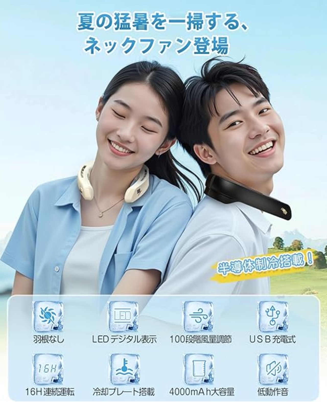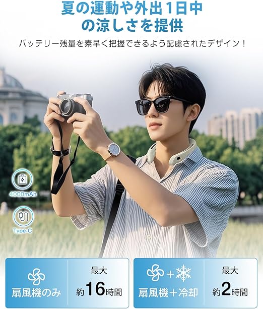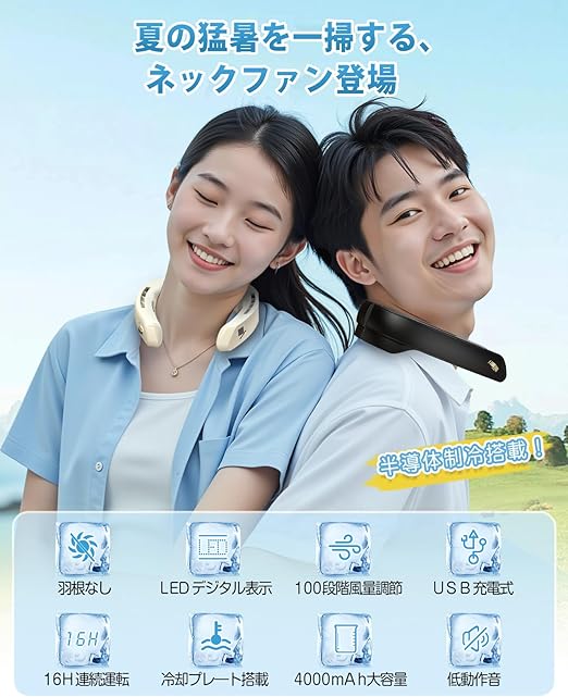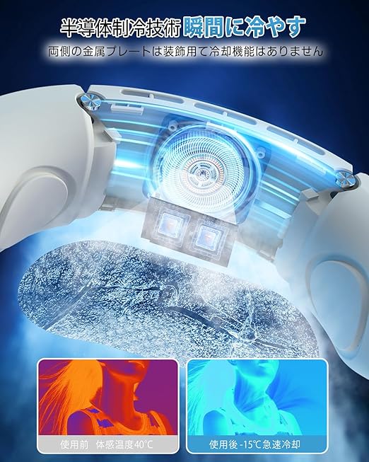 【2025年モデル・瞬冷ネッククーラー】半導体冷却技術を搭載した次世代ネッククーラー 冷却プレートが登場!首の後ろには市販の接触涼感金属プレートではなく、ペルチェ素子付き 冷却プレートであり、首元を瞬時にクールダウン!わずか2秒でひんやり体感でき、体感温度を最大-15℃もダウン。従来の首掛け扇風機を超える30%以上の冷却力で、灼熱の夏も快適に!両側の金属プレートはペルチェ素子ではないが接触冷感可能で肌に触れるとひんやり感を提供します。